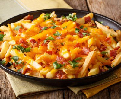 Golden Deep-Fried, Crinkle-Cut Fries Loaded with Melted Cheddar Jack Cheese and Crispy Bacon.
