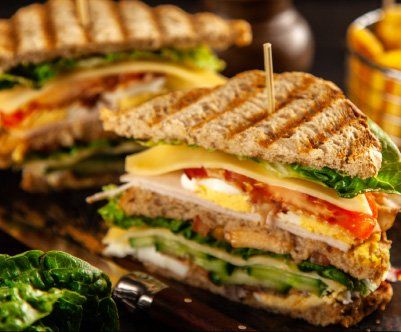 Fresh, Locally Sliced Ham and Turkey topped with Crispy Bacon, American Cheese, Lettuce, Tomato and Mayo on toasted Wheatberry Bread. Served with Kettle-Cooked Potato Chips